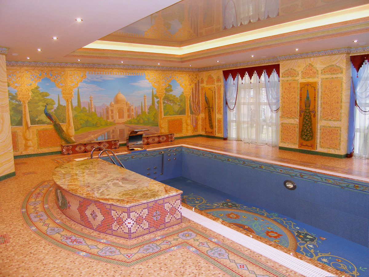Да, конечно. Роспись покрывается защитным лаком. Она прекрасно себя чувствует как в бассейне, так и в гостиной и спокойно выдерживает влажную уборку. Главное - без фанатизма…